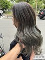全体にしっかりめにケアブリーチでハイライトを入れて、濃いめのオリーブベージュを○赤みをしっかり消したい、オリーブ感がしっかり欲しい方にオススメなデザインカラーです!