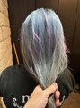 表面のみブリーチを施し毛先に紫を入れる事で締まりのあるデザインに仕上げました。フェイス部分は地毛の黒を残しやりすぎない様にしています。