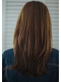 センターで前髪を分けたレイヤースタイル。サイドとトップにレイヤーを入れてあるので、巻いたカールがしっかり出るようになっています。カラーはお肌の色に合わせて明るめのブラウンにしています。