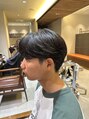 前髪は目にかかる長さ、サイドも少し耳にかかる長さで設定をして後ろは薄くなりすぎない程度にシルエットがキレイにでる場所で刈り上げ、毛先が流れる程度のニュアンスパーマをかけています