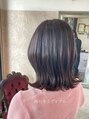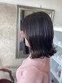 肩に当たる長さを外ハネにカールしたミディアムスタイルになります。前髪、サイドバングはお顔の輪郭に合わせてひし形シルエットになる様にかっとしています。
