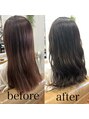 ターンダウンで暗髪グレージュで落ち着いた透明感のある艶髪に。カットは毛量調整と毛先整えて波巻きで仕上げております。