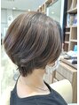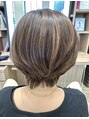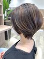 ショートボブ。首元はすっきりで顎ラインでカットをしているのでお顔もスッキリに見えます!カラーは、ブリーチは使わずハイライトで動きをだしています!色味は、赤味系で色落ちしても黄色側に行かないように?