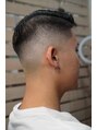 刈り上げはスキンフェード、分け目にラインを入れたパートスタイルです。