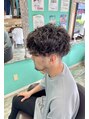 ツイストスパイラルパーマ。パーマがかかりにくい髪質もしっかりカールさせます。サイドとバックはツーブロックに。