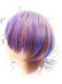 高校生が毎回色々な題材で楽しませてもらっています。マッシュウルフにブリーチ・ダブルカラーをしてバイオレット+ブルー+クリアで塩基性カラーで仕上げました