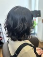 肩下の前下がり切りっぱなしボブです。ストレートでも可愛いですが今回は巻き髪アレンジをしてみました。毛先は外はねに、表面は平巻きで大きく動かしました。