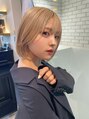 サイドバングが流れるようにフェイスレイヤーを入れた日韓ボブ。ブリーチ2回して色を抜いた後にベージュ系カラーでオンカラー。丸み感を出すのがスタイリングポイント。
