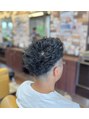 ツーブロックにより刈り上げとパーマをはっきりさせ、フロントにボリュームがくるようにデザインしました。細かいロットで巻いたり敢えて巻かなかったりし強めに巻くことで、メリハリをつけはっきりとしたシルエットに仕上げました。