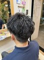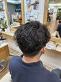 波巻きパーマをロッド細めで本数多めで細かめに巻いて、カール感を強めに出しました髪が少し長めのじゃないと、このようなパーマは意外と短くなりますウェットな質感のスタイリングが、かっこいいですねクリームパーマでかけたので、強くても柔らかい質感