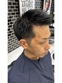 毛量も多く、全体的に膨らみやすいのでサイドとバッグは刈り上げてトップと前髪は立ちやすいので長さを少しだけ残して流しやすくしグリースを付けてセット。