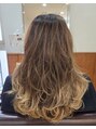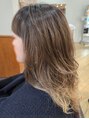 ミディアムロングにレイヤーを入れ、それに合わせて毛先に好みの幅でブリーチを入れました。根元は暗めのカラーにし、グラデーションになるように。髪をまとめたときも綺麗に出ます。