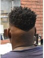 ブラックヘアーを活かしたフェードスタイル。バックにVのラインを入れてデザインフェードに。トップは特殊スポンジで束間を作りパートラインを。直毛の方は針金パーマをかけることで、ブラックヘアを再現できます。