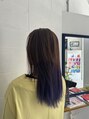 2ウェイカラーを施すために、中間から毛先にかけてブリーチをし紫をかぶせました。根本は、白髪にも色味が入るカラー剤を使用し、メリハリのある施術をさせていただきました。※マニキュアは常時ある色でございませんので、事前にスタッフへご相談ください。