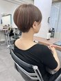 マッシュショートで丸みを出しながらしっかり軽さを入れコンパクトにしました。襟足部分は刈り上げスッキリさせています。カラーは白髪が溶け込むベージュカラーに。石田指名をクリックしご予約お待ちいたしております。