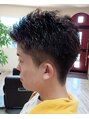 バックは短く刈上げ、サイドは骨格に合わせてツーブロックを入れ広がりを抑えることを意識しました。自然と流れるように毛量調整をしました。前髪がおでこや目にかからないので表情が見え明るい雰囲気になりおすすめです。