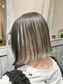 インナーをケアブリーチカラー後、透け感のあるグレージュをオンカラー。ダブルカラーで透明感をしっかり出しました。髪質改善トリートメントを超音波アイロンで浸透させることによって髪の毛を補修し、ダメージを防ぎます。全体は軽さのあるボブに。