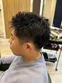 ナチュラルフェードにカットし、全体に無造作になるようピンパーマをかけたスタイルです。ジェルやグリースを揉み込むだけで無造作に動きが出てスパイキーショートになるスタイルになってます