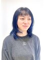 サイドのアウトラインと後ろは毛先だけブルーに染めたフェイスフレーミングカラーを施したミディアムスタイル。バングはオン眉で個性的にしました。