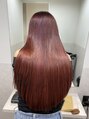 深みと彩度の有るワインレッドカラー。ハイライトと黒染めの複雑履歴を傷まないように、2回ブリーチをしてベースを整えることで、ワントーンの綺麗なカラーリングが可能です。
