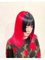 派手髪、レッドカラー前髪姫ゾーンブラック特殊カラー、デザイカラーヒョウ柄カラー。レイヤーカットと姫カットを組み合わせたデザインカット。派手髪界隈/姫カット界隈/V系/ストリート系女子/目立つ髪型/個性派/個性派ヘア/姫カットウルフ/レイヤーカット/