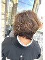 ハイライトブリーチカラーで、全体の色味も柔らかいベージュ系に!カットは、前下りのショートボブでアイロンで動きをだしています。