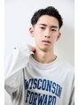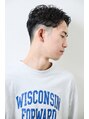 64分けくらいのルーズバックスタイル。周りはツーブロックと刈り上げですっきりと爽やかな印象に。トップはパーマをかけて少しのカール感を+。シティボーイ系ファッションに◎。<池袋> <理容室> <バーバー> <理容室> <床屋> <理容室> <池袋> <理容室>