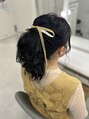 ミディアムの長さで中間ポニーテール。長さを出すために下は残して縦長のポニーテールに仕上げました。