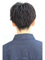 サイドはツーブロック、バックは刈り上げ、トップはショートレイヤーベースです。前髪は分けることも下ろすこともできる目上の長さです。緩めのパーマをかけクセ風のカールが出るようにしています。セット次第でどんな場面にも対応できるスタイルです。