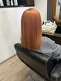 「ピンクオレンジカラーで個性を引き立てるスタイルに。鮮やかな色味とツヤ感が、シンプルなカットラインを一層魅力的に見せます。」