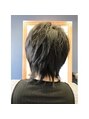 柔らかめのクセ毛。ショートスタイルにはもってこいの髪質。サイドはがっつり刈ってとことんまでの毛量調整を施しております。黒髪がロックなテイストを醸し出して彼女の雰囲気にかなりフィットしています。いちばんのおススメは顔回りのマッシュラインです。