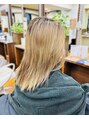 アマトラトリートメント(髪質改善トリートメント)とワンカラーで、ブルーアッシュに。ベースが明るい人には、アッシュの色味がはっきり出て、すごくきれいなブルー系のスタイルになります。