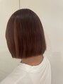 切りっぱなし、ぱっつんボブ。インナーはブリーチしてピンク系。全体も暖色系カラー。表面にインナーがみえるぐらい、インナーのブリーチは広めにとっています。そんなインナーカラーが透ける感じが可愛いです。