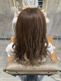 細くハイライトを入れて白髪ぼかしにもなり動きのあるスタイルに!全体はベージュ系のカラー!重さを残したロングヘア。毛先32mmのカールでゆるふわ!