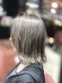 肩上のぱっつんボブに軽くレイヤーを入れたスタイル弱いブリーチでハイライトメッシュを入れて白髪ぼかしをしてからグレージュ系ブラウンで赤みを抑えるカラーで全体を染めました。是非 お試し下さい。