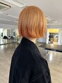 カットのポイントは顔まわりにあそびを効かせたラインです。さりげなく攻めたデザインですが、しっかりフィットさせてます!カラーはペールオレンジで、濃いオレンジで同系色のコントラストで違和感なくエッジを効かせたデザインカラーにしています。
