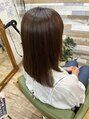 カット、ウルティア縮毛矯正。毛先のメンテナンスカット。レイヤースタイルから徐々にワンレンに移行中。広がりが強いがうねりも多少ある癖質、酸性よりののアルカリミックス、既ストレート部は微還元トリートメントを。