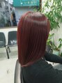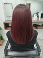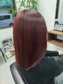 切りっぱなしのミディアムスタイルに、深みのあるレッド系カラー。暖色系で染める事でより艶感もアップします^^