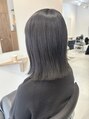 ダークトーンのグレージュカラーにブルーの色味をしっかり入れたヘアカラーを施しました。青みが強いと肌を白く見せてくれ、かつ輪郭の引き締め効果も高いです。暗めの色なので艶感はもちろんの事、透明感も感じるカラーなので髪を綺麗に見せたい人に◎