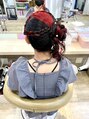 編み込みカチューシャにサイドお団子アップスタイルです!お友達とお揃いでやると可愛いです(^○^)リボン、パールピンは当店で販売ありますのでスタッフまでお問い合わせください。