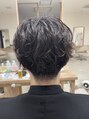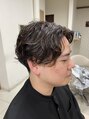 センターパートスタイルに、緩めのツイストスパイラルに波パーマで動きを出しました。大きなシルエットにならない様にパーマとカットで調整し襟足はナチュラルに弧を描くように刈り上げました。