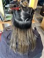 ブリーチ2回は必須になります表面はアンブレラカラーで薄い紫で白っぽく抜けていくので色落ちも楽しめます。インナーカラーは水色で間のブラックカラーか2色を引き立てて綺麗です。特殊カラーになります。