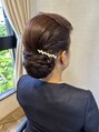 ご新郎様のお母様のヘアセットをさせていただきました!紺のドレスにお花の形の髪飾りが素敵で、右側にはパール系の髪飾りとてもお似合いでした!このように襟足ラインより下にシニヨンを下げることで豪華さが演出できるのと横顔が一段と素敵になります。