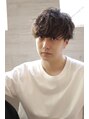 刈り上げツーブロックのマッシュショートベース。前髪は目にかかる位の長さに設定。サイドは耳にかかる程度。ラフにミックスさせたスパイラルパーマでランダムな動きを出して立体感とボリュームをコントロール。