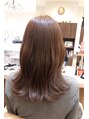 赤みをおさえたベージュ系カラーです。ぱつっと切り揃えたスタイルは髪の毛の綺麗さを際立たせます。仕上げにくびれるようにアイロンを入れてヘアオイルでととのえます。