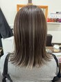 肩ラインの切りっぱなしの外ハネスタイルで全体に少し太めのハイライトを入れベージュグレイをいれました☆