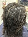 今回はストレートパーマです。チリチリとウェーブが混ざった広がりやすい髪質です。それぞれの得意な薬剤を使って、ポリフェノールと髪質改善を合わせて行っていきます。