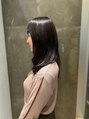 シックな暗髪で、知的な印象を。アクセントにブルーヴァイオレットをプラスして、落ち着いたトーンのカラーでも優しい雰囲気を。鎖骨下~胸上のレングス、前髪は眉下でCUT。フェイスラインにはレイヤーをいれました。中間~毛先に大きめカールをON。