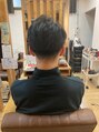 もともと直毛なので髪が立ってしまうのもあり直線的に刈上げるとつんつんした印象のスタイルになってしまうので刈り上げのラインをコンケープ(湾曲)するように刈上げ後頭部を膨らんで見せるようにラインどりしました。