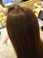 全体イルミナカラーで染めてます。根元があがりやすいため、根元と毛先の明るさ、変えてます。38ミリのコテでリバースに巻いてます。前髪はマジックカーラー大を使用し顔まわりがなじむように流れを作ってスタイリングしてます(^-^)